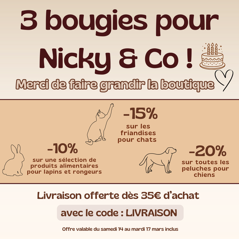 Nicky & Co est une boutique imaginée et créée par Mathilda en septembre 2022, elle est divisée en 2 parties. D'un côté, la boutique spécialisée pour vos animaux. Chiens, chats, lapins et autres petits rongeurs.